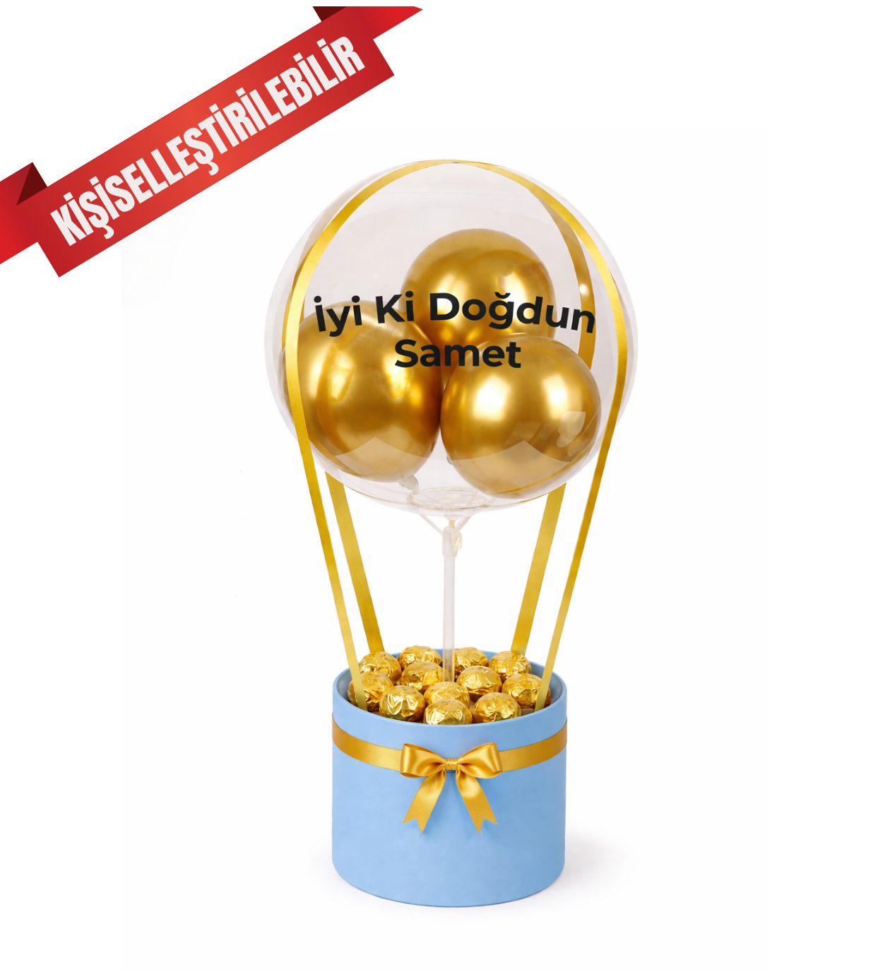 Şıklık ve ihtişamı bir araya getiren bu özel balon kutusu, altın tonlarının ışıltısıyla dikkat çeker. Mavi silindir kutu üzerine yerleştirilen gold detaylar ve kurdele süslemesi, ürüne premium bir görünüm kazandırır.
