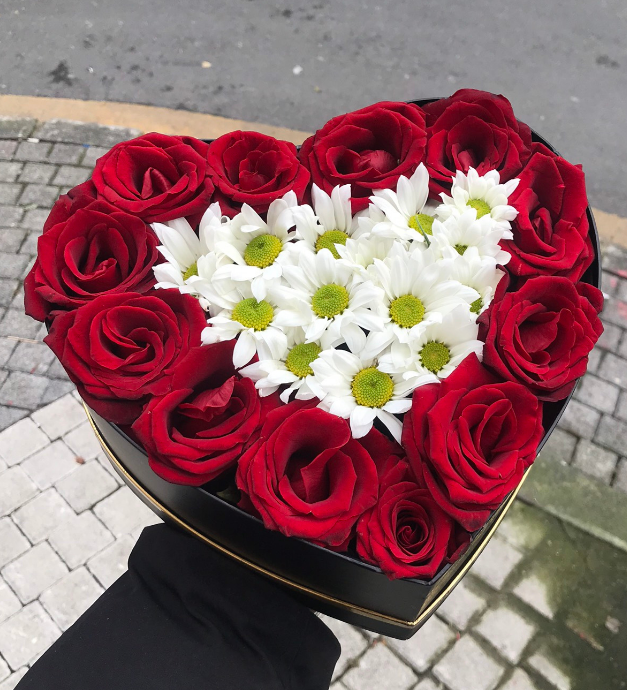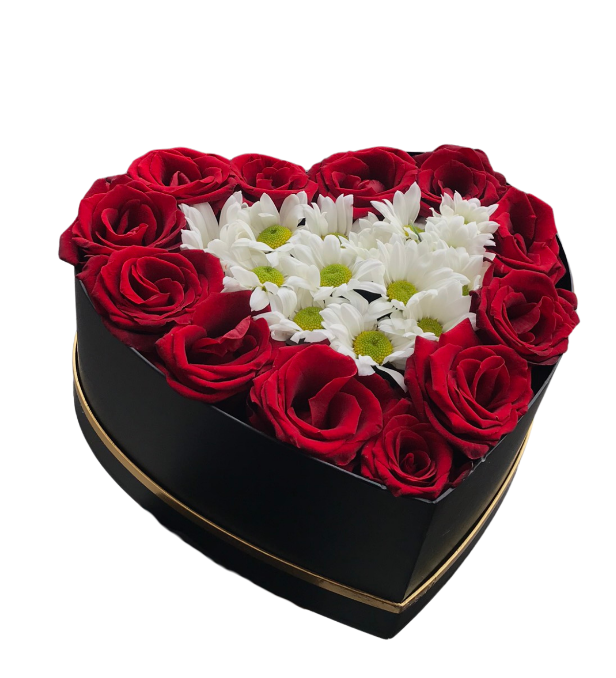 Mat siyah kalp kutu içerisinde özenle yerleştirilen taptaze kırmızı güller, merkezdeki beyaz papatyalarla göz alıcı bir kontrast oluşturur. Romantik, anlamlı ve unutulmaz bir hediye alternatifi arayanlar için ideal bir seçimdir.