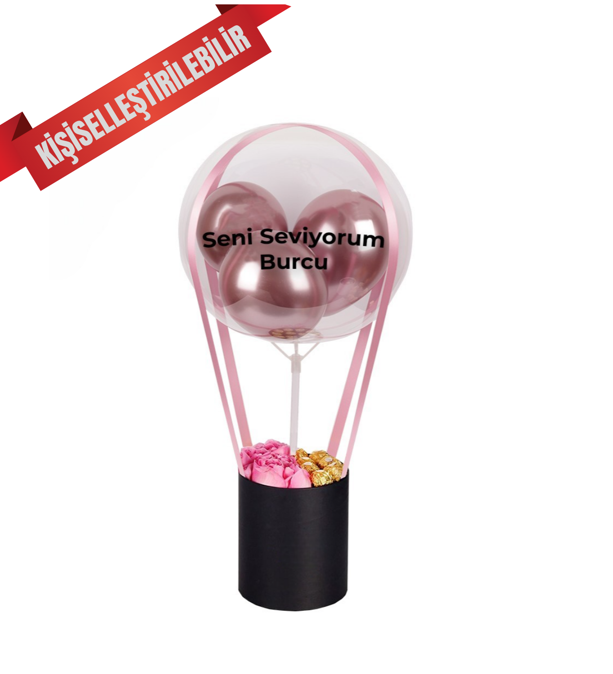 Şeffaf balon içerisinde yer alan kişiye özel yazı detayı ile tamamen size özel hale getirilen bu tasarım, hem görsel şıklığı hem de içeriğindeki sürprizlerle unutulmaz bir hediye alternatifi oluşturur.