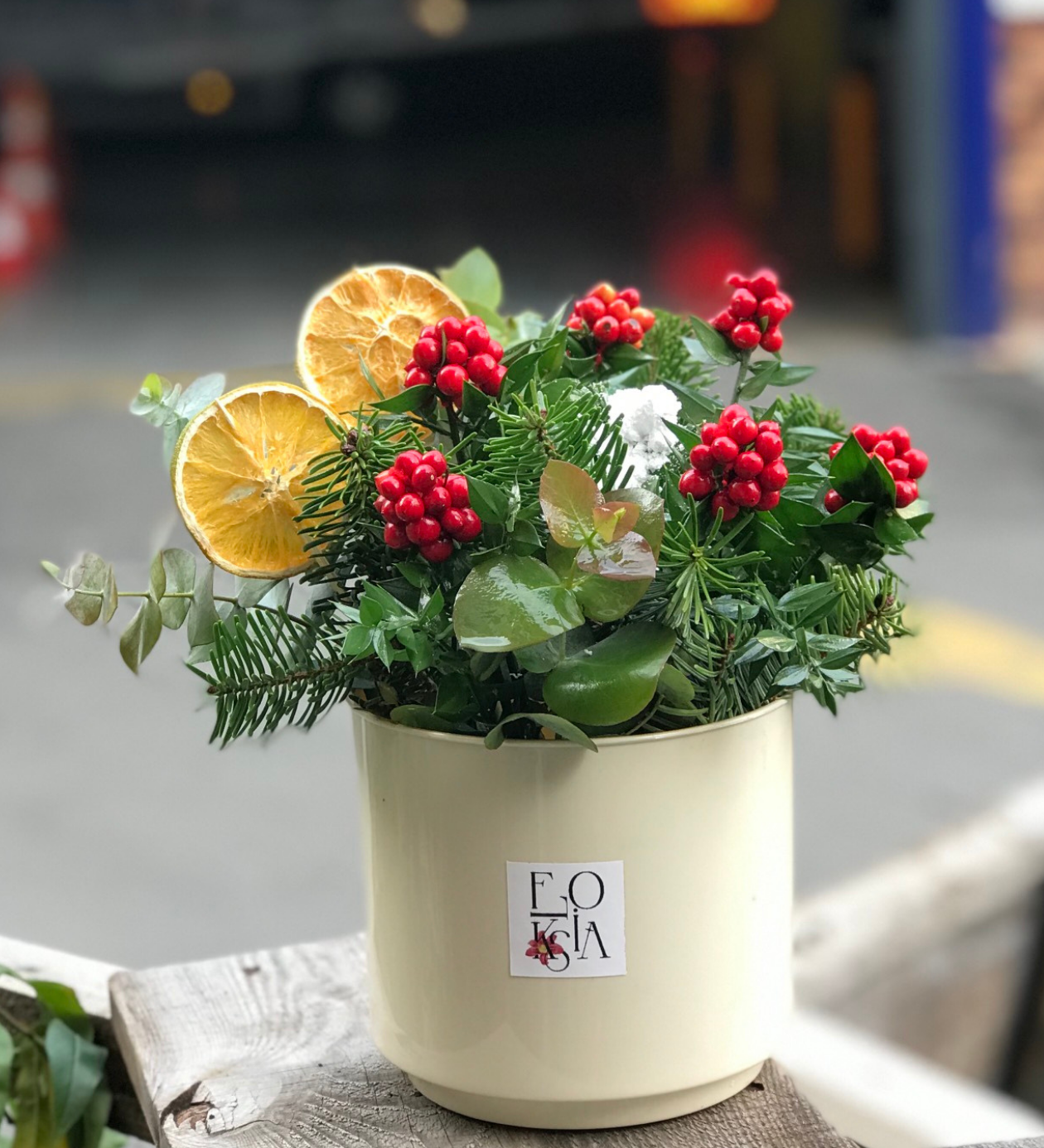 New Year Joy, Floksia Flowers’ın yeni yıl ruhuna özel olarak hazırladığı şık ve modern yılbaşı tasarımlarından biridir. 6 dal canlı kokina, 2 dal portakal kurusu ve özel tasarım plastik vazo ile hazırlanan bu aranjman; doğal renklerin sıcaklığı, yılbaşı sembolleri ve Floksia’nın zarif dokunuşlarıyla birleşerek göz alıcı bir bütünlük oluşturur.