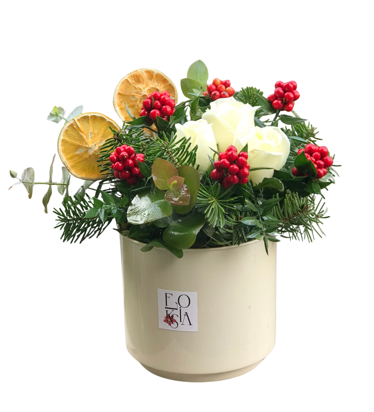 Yılbaşı çiçek aranjmanı, kokina aranjmanı, beyaz güllü yılbaşı tasarımı, Floksia yılbaşı çiçekleri, yeni yıl dekoratif çiçek