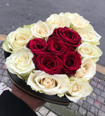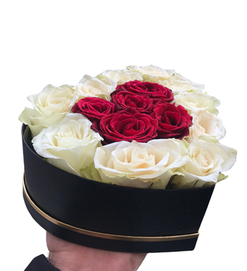 Siyah yuvarlak özel kutu içerisinde beyaz güllerin çevrelediği kırmızı gül merkez tasarımı, klasik şıklığı modern bir dokunuşla buluşturur. Beyaz güller saflığı ve zarafeti temsil ederken, ortada yer alan kırmızı güller tutkulu duyguların güçlü bir ifadesidir.