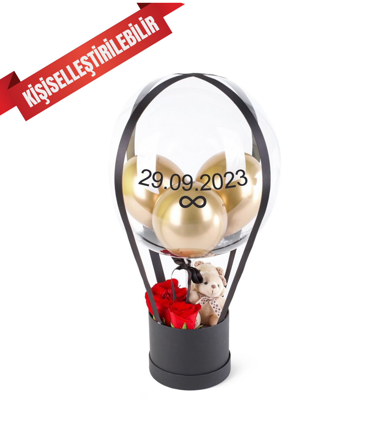 Aşkınızın en özel gününü, sonsuzluğu simgeleyen bir hediye ile taçlandırın. Şık siyah kutu, tutkunun simgesi kırmızı güller ve sevimli bir peluş ayıcıkla dolu. Şeffaf balonun içindeki ışıltılı altın metalik balonlar ve üzerindeki kişiye özel tarih ve sonsuzluk sembolü, bu aranjmanı yıldönümünüz için eşsiz ve anlamlı kılıyor. Birlikteliğinizin her yılını kutlamak için romantik ve unutulmaz bir seçim.