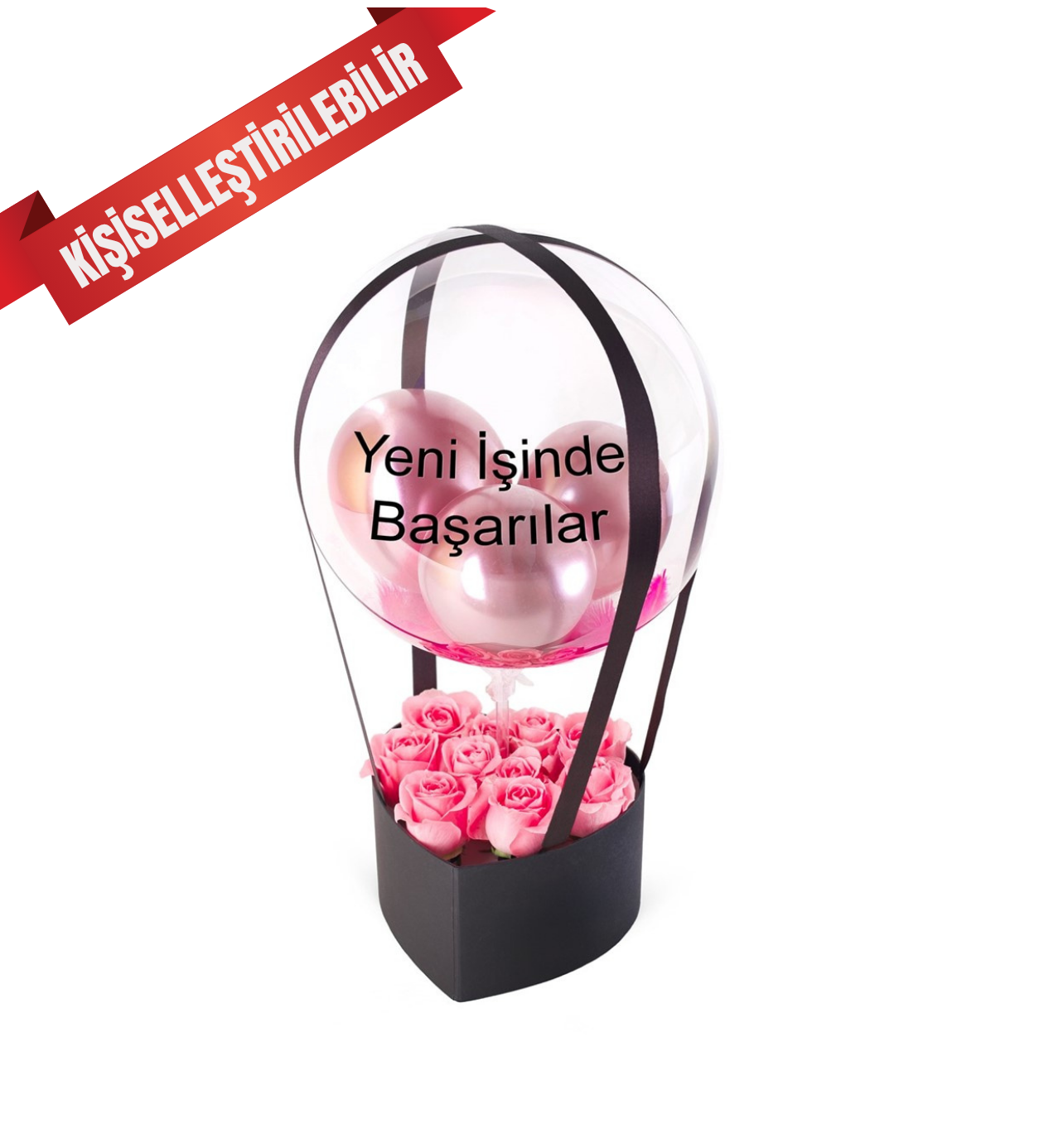 Sevdiklerinizin yeni başlangıçlarını, onlara şans ve mutluluk getirecek bir hediye ile kutlayın. Siyah kalp şeklindeki kutu, zarafetin ve neşenin simgesi pembe güllerle dolu. Şeffaf balonun içindeki metalik pembe balonlar ve üzerindeki "Yeni İşinde Başarılar" mesajı, bu aranjmanı yeni iş tebrikleri, terfiler veya iş yeri açılışları için modern ve anlamlı kılıyor. Onlara desteğinizi ve iyi dileklerinizi şık bir şekilde sunun.