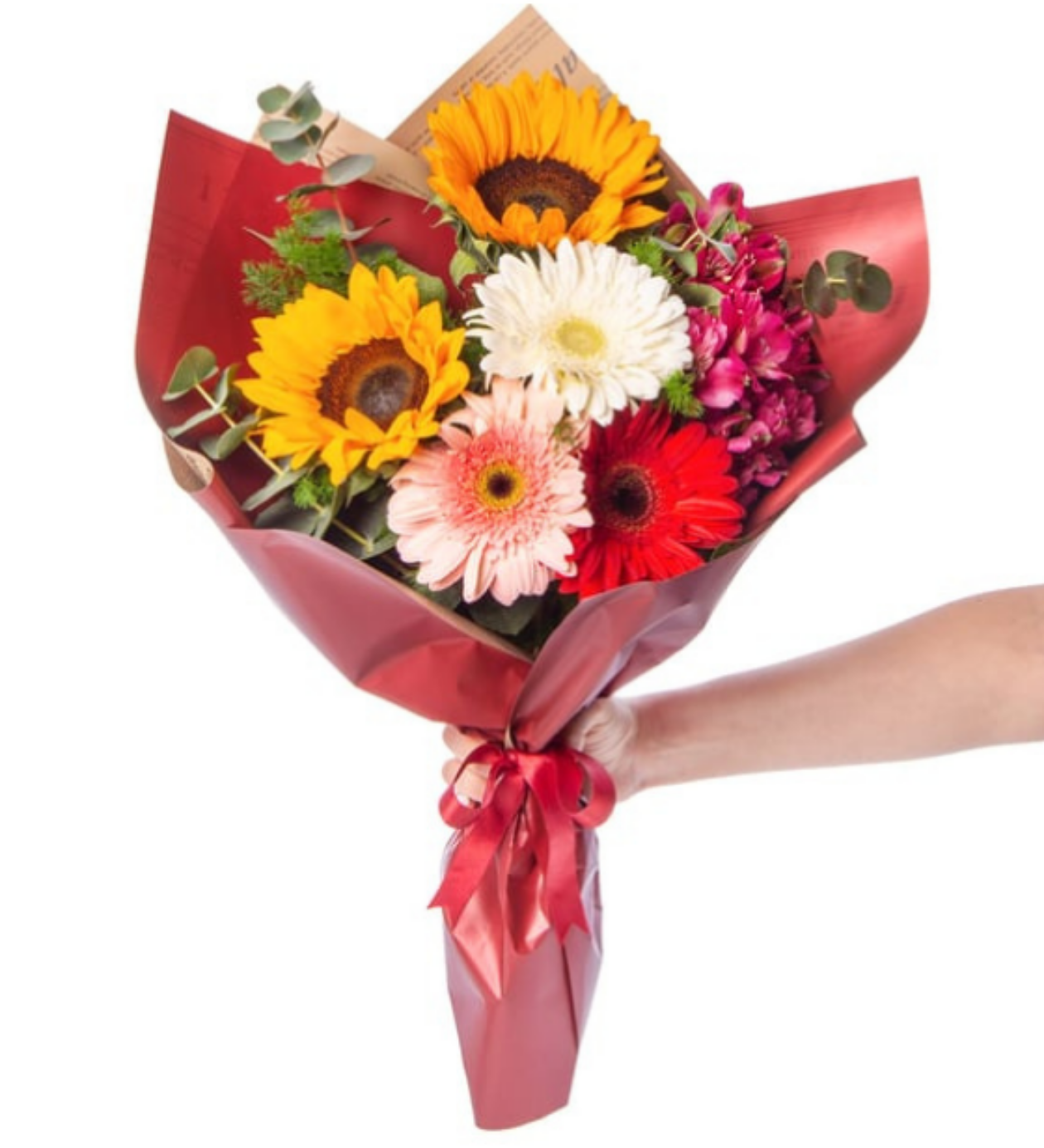 Ayçiçeği parlak sarı rengiyle neşeyi ve canlılığı simgelemektedir. Buketteki varlığı, güneşin ve doğanın özünü yakalayan bir enerji ve iyimserlik dokunuşu sağlar. Kırmızı, pembe ve beyaz gerberalar canlı ve çekici bir kontrast katıyor; her biri sevginin, hassasiyetin ve saflığın farklı tonlarını temsil ediyor.