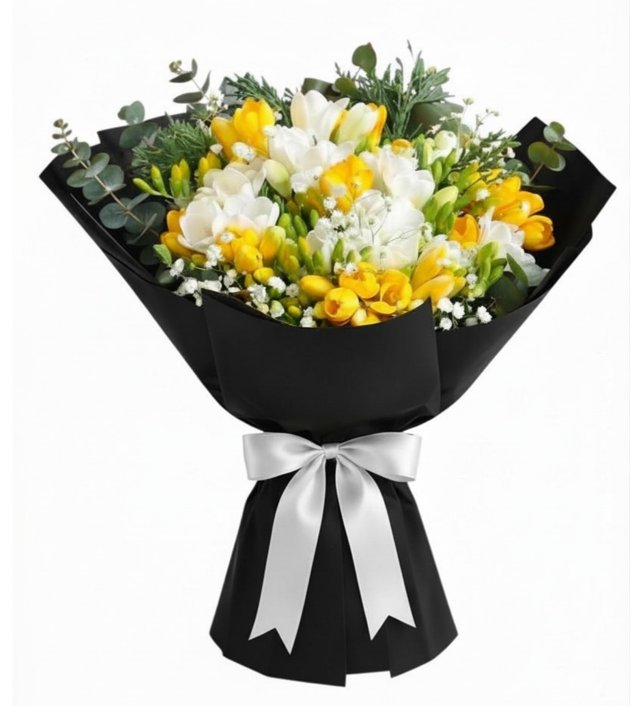 Floksia’nın modern tasarım anlayışıyla hazırlanan bu özel buket, göz alıcı siyah ambalajı ve zarif saten kurdele detayıyla dikkat çeker. Sarı ve beyaz frezyaların doğal uyumu, hem enerjik hem de saf bir görünüm sunar.