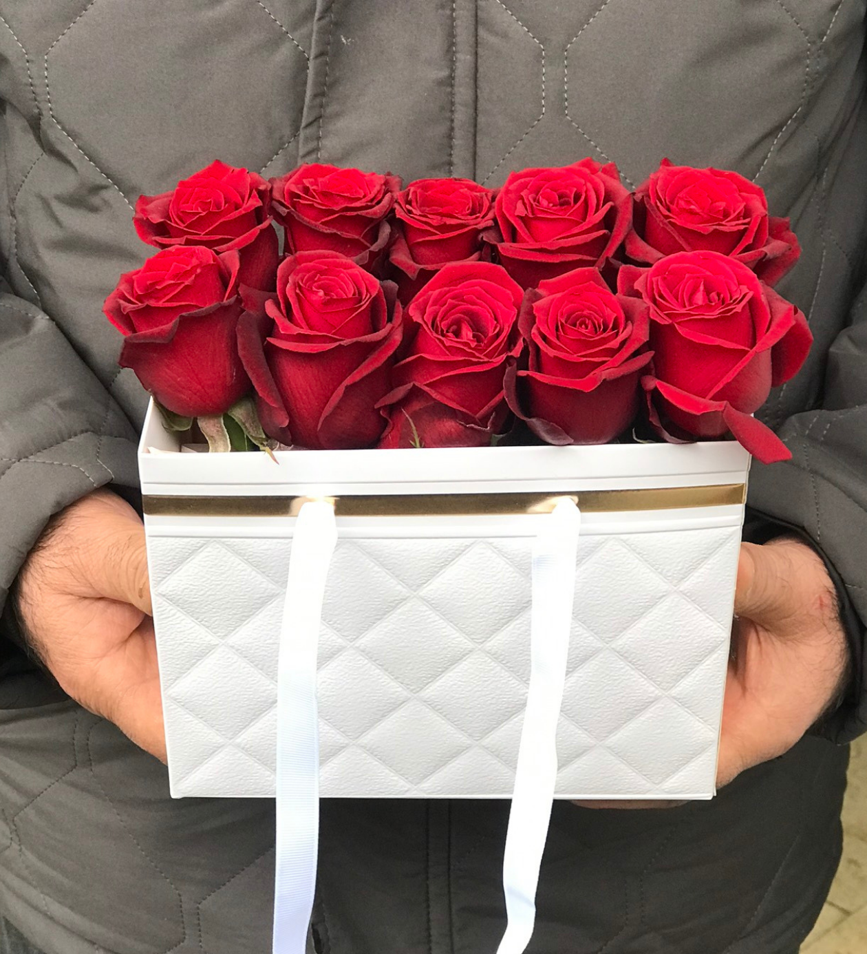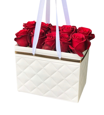 Premium kalitede 10 adet taze kırmızı gül, şık ve dokulu beyaz çanta kutu içerisine özenle yerleştirilerek hem minimal hem de lüks bir görünüm sağlar. Taşıma saplı tasarımı sayesinde hem estetik hem de pratik bir sunum sunar. Sevdiklerinize romantik, zarif ve akılda kalıcı bir sürpriz yapmak için mükemmel bir tercihtir.