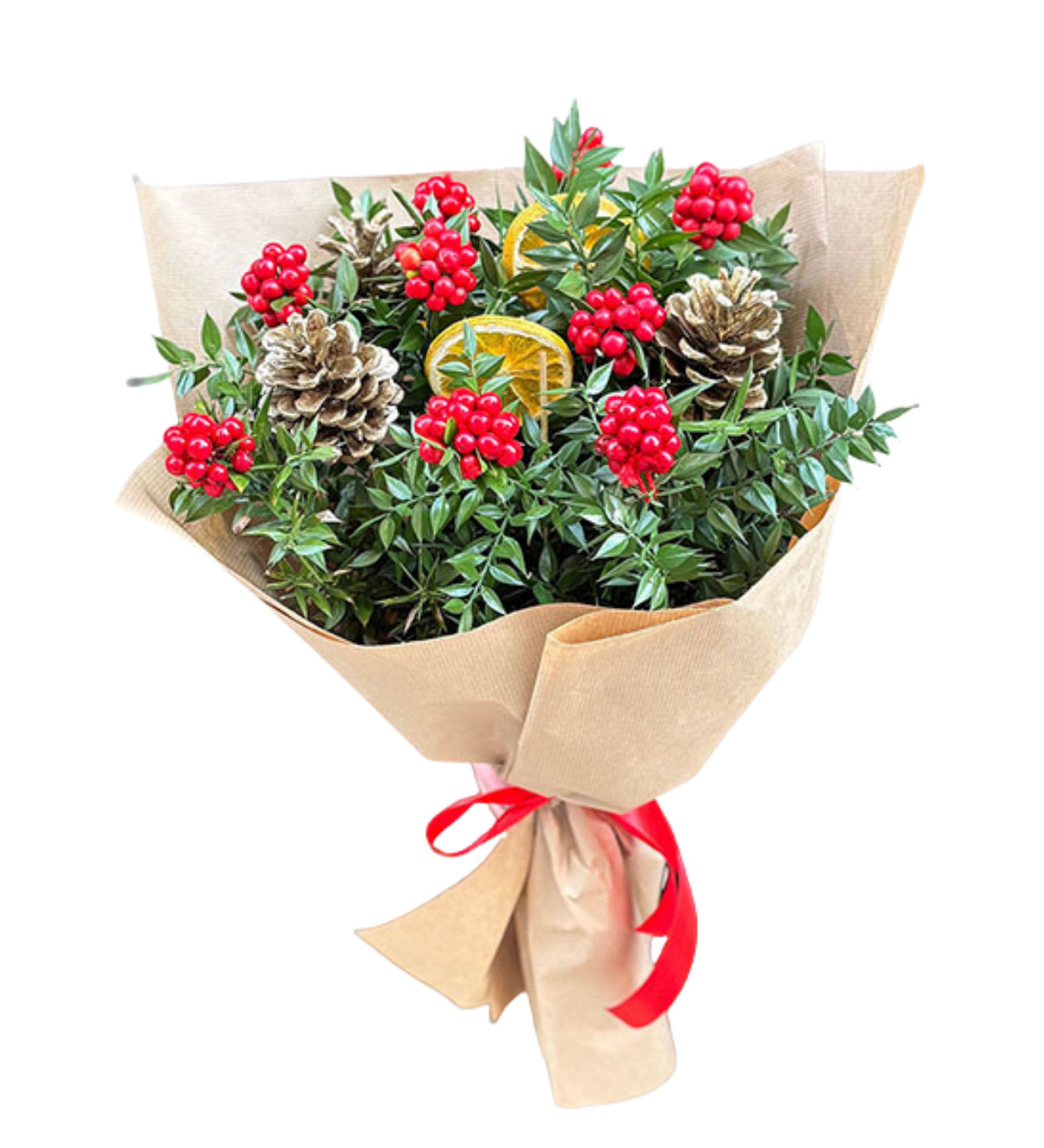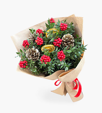 Yeni yılın bereketini ve şansını simgeleyen kokina dalları, doğal yeşillikler, çam kozalakları ve dekoratif kurutulmuş portakal dilimleri ile hazırlanan bu özel buket; sade, doğal ve şık bir yılbaşı tasarımı sunar. Kraft ambalaj ve kırmızı kurdele detayıyla tamamlanan aranjman, doğallığı sevenler için sıcak ve samimi bir hediye alternatifidir.