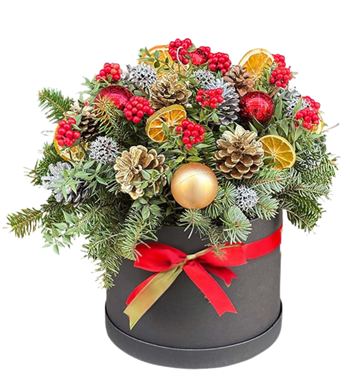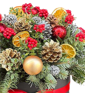 Yeni yılın sıcak ve ihtişamlı ruhunu yansıtan bu premium yılbaşı kutu aranjmanı, taze çam dalları, kokina meyveleri, doğal çam kozalakları, dekoratif kurutulmuş portakal dilimleri ve yılbaşı süsleri ile özenle hazırlandı. Siyah silindir kutu ve kırmızı–altın kurdele detayı, aranjmana modern ve zarif bir görünüm kazandırır.