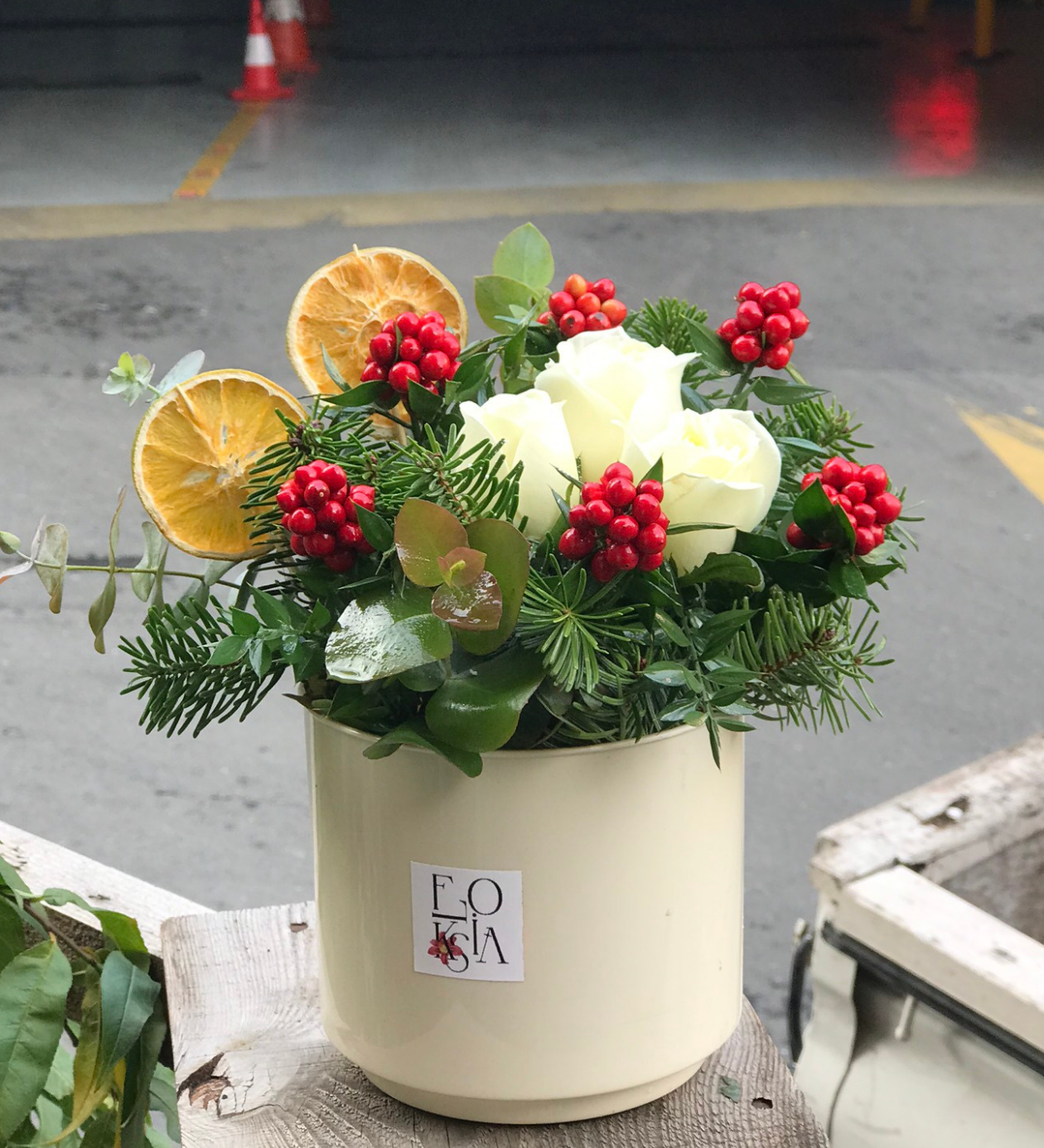 Kokinanın kırmızı tonları yılbaşı bereketini temsil ederken, beyaz güller huzurun ve yeni başlangıçların sembolüdür. Portakal kurularının sıcak dokusuyla tamamlanan bu tasarım; ev, ofis ve mağazalara yılbaşı ruhunu estetik bir şekilde taşır. Hem dekorasyon hem de hediye olarak tercih edildiğinde güçlü bir yeni yıl mesajı iletir.