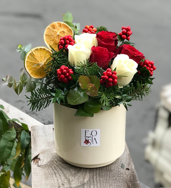 New Year Joy Güller, Floksia Flowers’ın yılbaşı konseptine özel olarak hazırladığı en zarif tasarımlardan biridir. 6 dal canlı kokina, 2 dal portakal kurusu, özel tasarım plastik vazo ve aranjmana hem şıklık hem de renk harmonisi katan 3 adet beyaz gül ile 3 adet kırmızı gül bir araya getirilerek oluşturulmuştur.