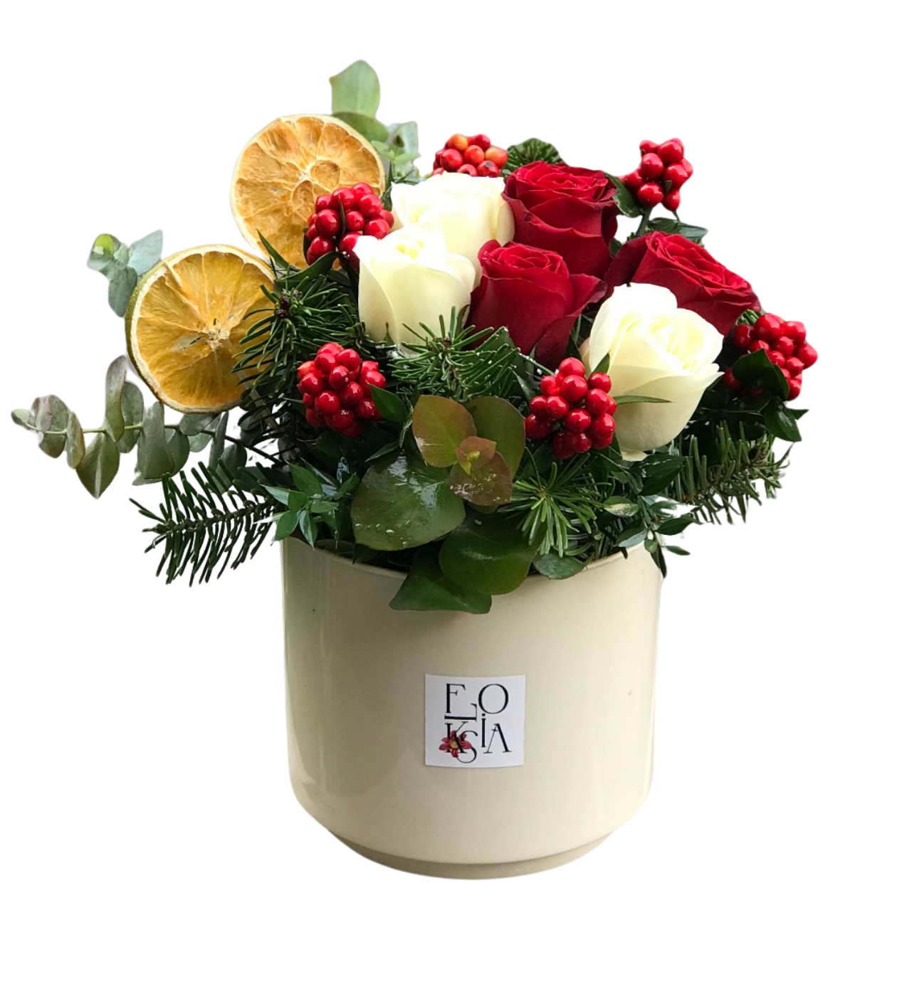 Yılbaşı çiçek aranjmanı, kokina gül aranjmanı, yılbaşı gül tasarımı, Floksia yılbaşı çiçekleri, yeni yıl dekoratif çiçek